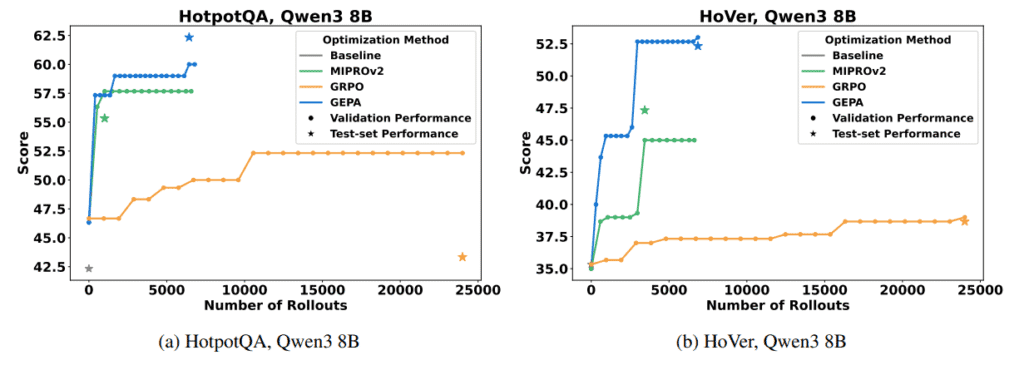 A imagem abaixo mostra a performance dos diferentes métodos de otimização de prompts no benchmark HotpotQA (à esquerda) e HoVer (à direita), utilizando o modelo Qwen3 8B.