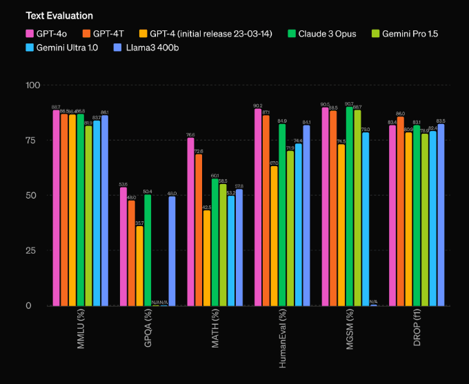 Abaixo você pode ver uma análise da capacidade de processamento de texto do GPT-4o, comparado a outros modelos líderes de mercado.
