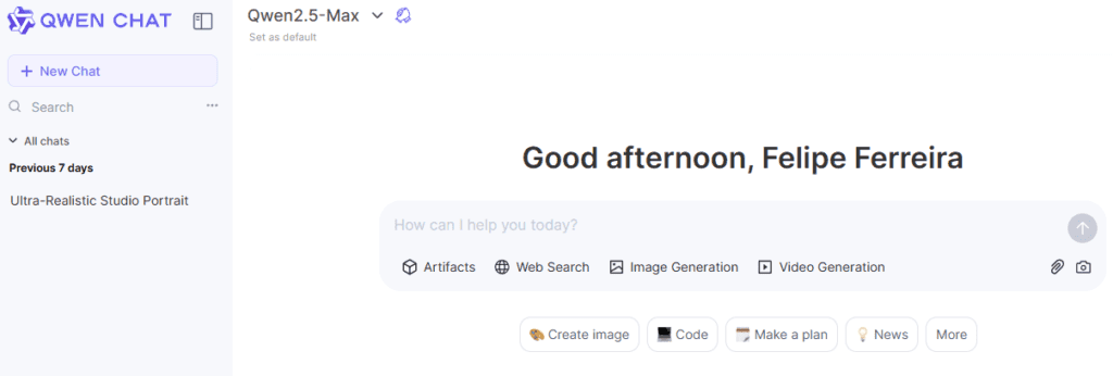 Qwen Chat: A plataforma Qwen Chat oferece uma interface web para interagir diretamente com o Qwen 2.5-Max, similar ao ChatGPT. Essa plataforma permite que usuários experimentem as capacidades do modelo e explorem suas funcionalidades de forma intuitiva e acessível. Clique AQUI para acessar!