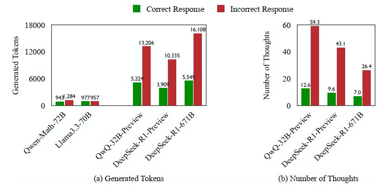 Por exemplo, o DeepSeek-R1-671B gera 16.108 tokens em respostas incorretas, muito mais do que os 5.549 tokens em respostas corretas.